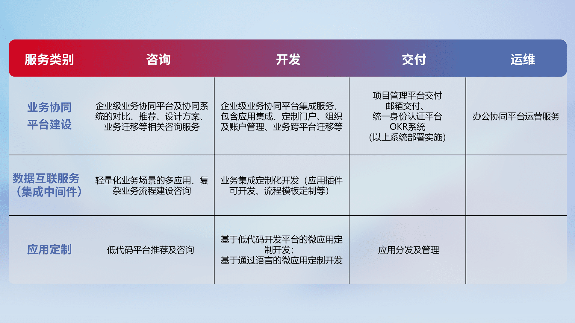 针对钉钉、、、企微、、IDaas等平台级产品提供产品的规划、、、、方案、、交付、、定制化开发等服务,,实现如统一协同办公、、智能客户服务、、混合会议管理、、、智能数据查询、、、等业务场景,,实现数字化转型。。。